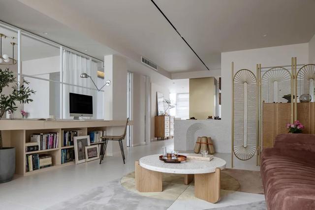 客堂的安排很有特性,冲破了以电视为中心的保守构造形式,并减少了书斋的功效。安排师废除了主卧和客堂之间的非承重墙体,替代成了白框玻璃窗,不只提高了客堂的视觉空间感,也能让主卧和客堂共享采写。
