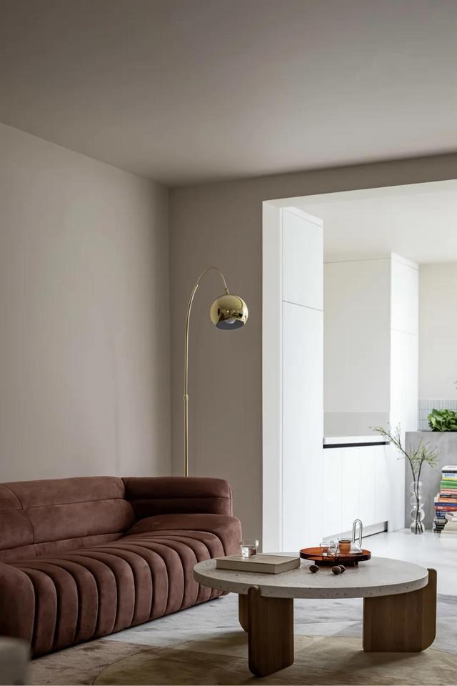 复旧棕色的毛绒沙发靠墙摆放,与硬装产生了明显的视觉反差,其自带的温润和稳重感,也激动了室内的完全平稳。沙发的左侧,摆放了一盏非金属色的垂钓灯,颜色和玄关的屏风相照应,质感实足。